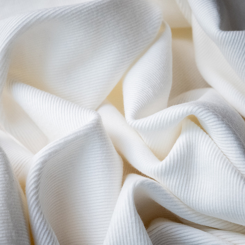Fabric No. 9053 is a 2x2 rib knit featuring 97% cotton and 3% spandex (Feature). This blend delivers a soft, breathable feel with the ideal stretch (Advantage), resulting in garments that offer natural comfort while maintaining a refined structure. Its slightly heavier 246gsm weight ensures a premium handfeel, making it suitable for creating pieces that are both well-defined and incredibly comfortable (Benefit).